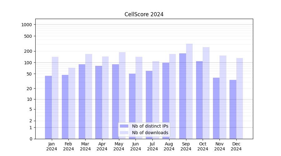 Number of downloads for software package CellScore, year by year, from 2025 back to 2014 (years with no downloads are omitted):
