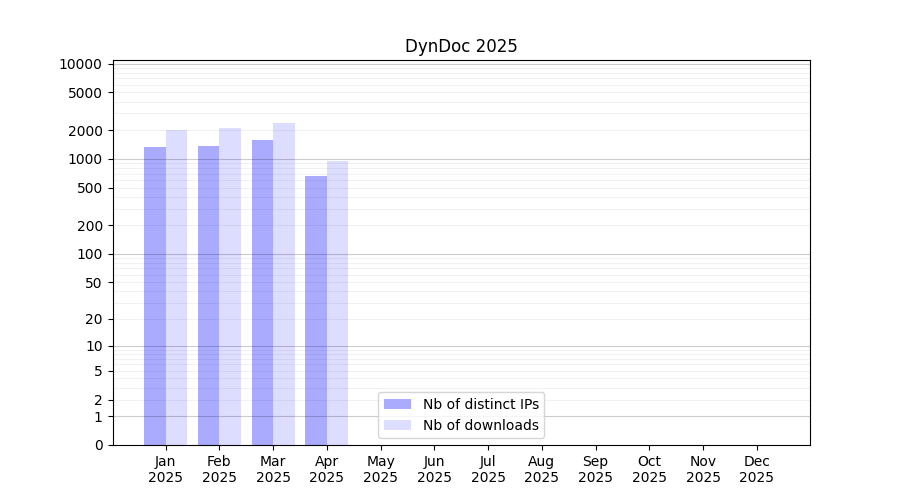 Number of downloads for software package DynDoc, year by year, from 2025 back to 2014 (years with no downloads are omitted):