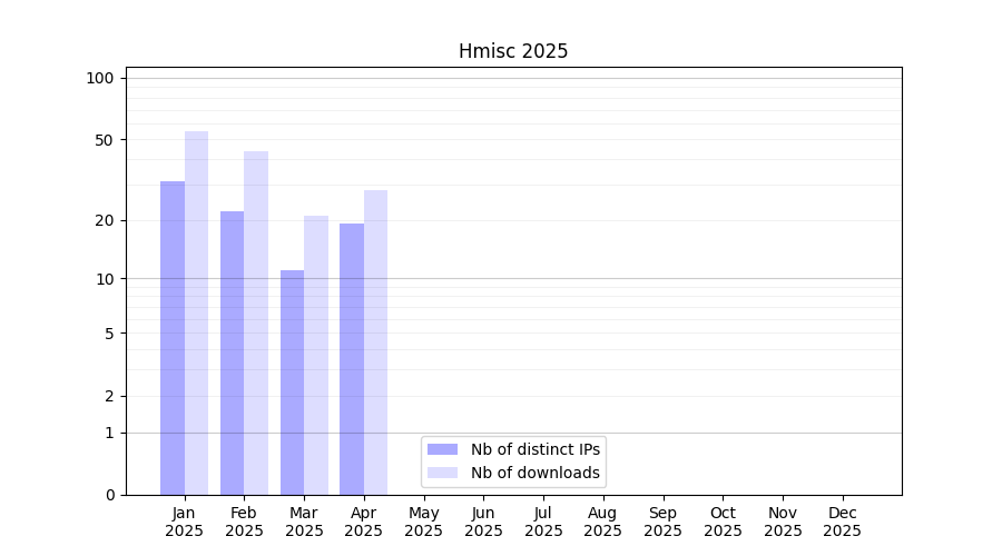 Number of downloads for software package Hmisc, year by year, from 2025 back to 2014 (years with no downloads are omitted):