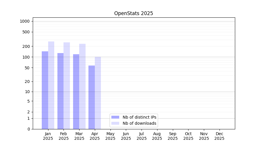 Number of downloads for software package OpenStats, year by year, from 2025 back to 2014 (years with no downloads are omitted):