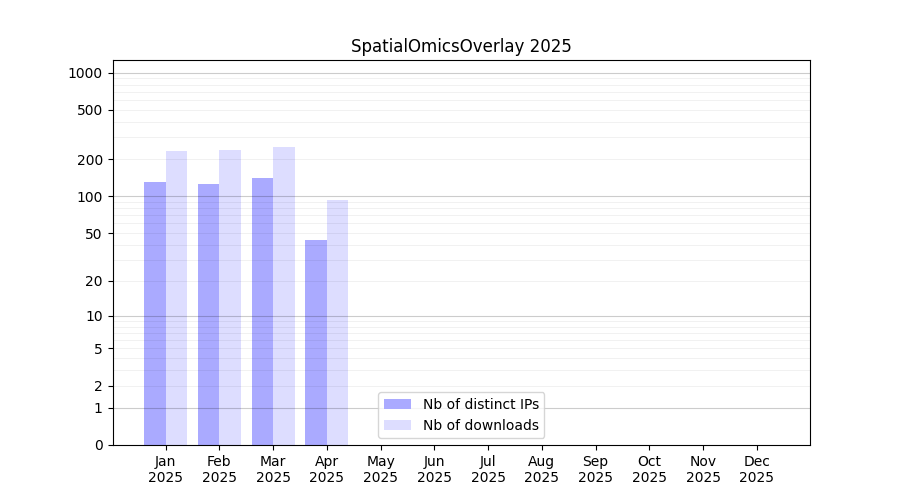 Number of downloads for software package SpatialOmicsOverlay, year by year, from 2025 back to 2014 (years with no downloads are omitted):