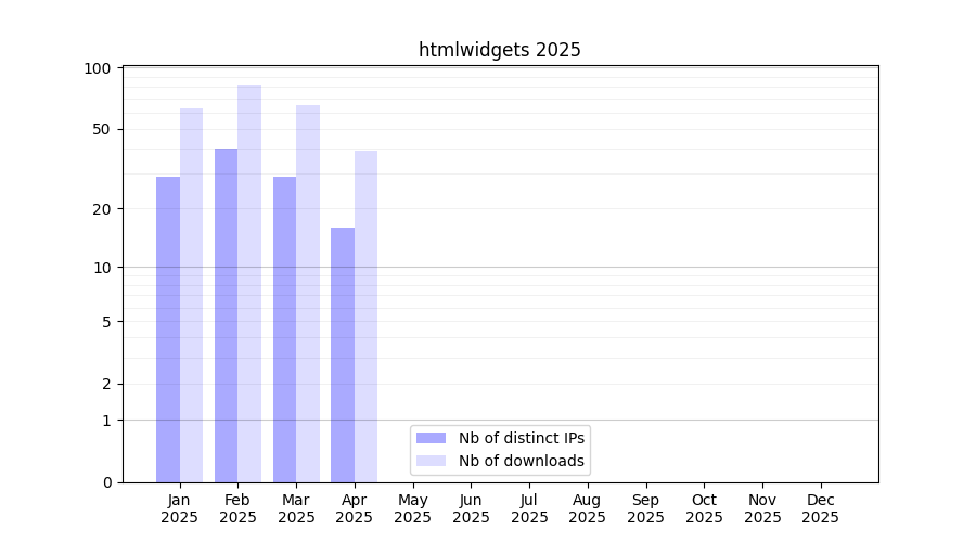 Number of downloads for software package htmlwidgets, year by year, from 2025 back to 2014 (years with no downloads are omitted):