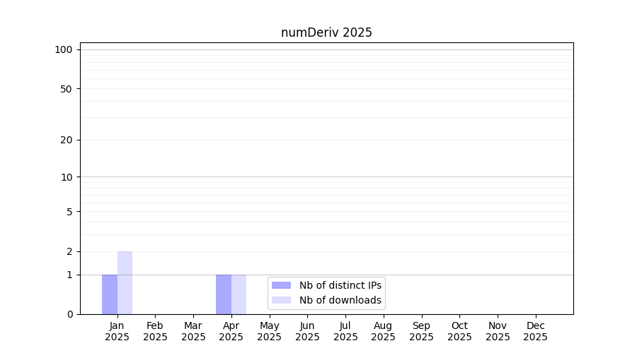 Number of downloads for software package numDeriv, year by year, from 2025 back to 2014 (years with no downloads are omitted):