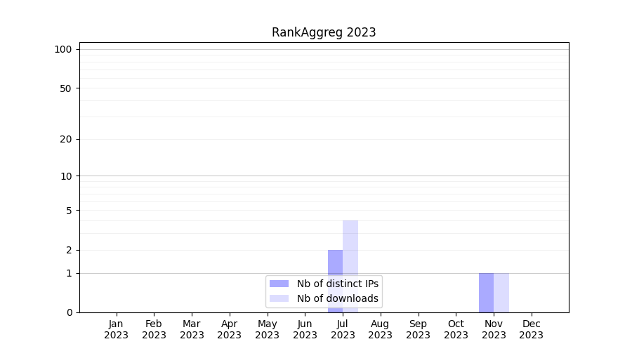 Number of downloads for annotation package RankAggreg, year by year, from 2025 back to 2014 (years with no downloads are omitted):