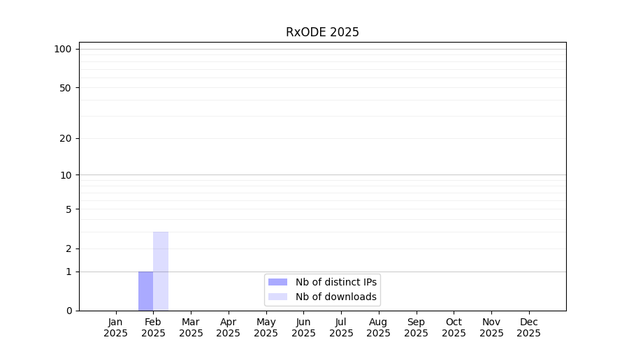Number of downloads for annotation package RxODE, year by year, from 2025 back to 2014 (years with no downloads are omitted):