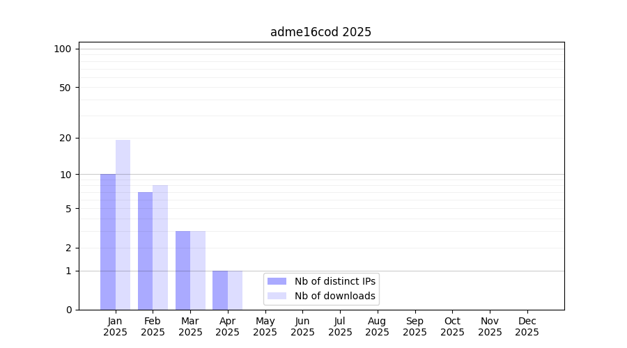 Number of downloads for annotation package adme16cod, year by year, from 2025 back to 2014 (years with no downloads are omitted):