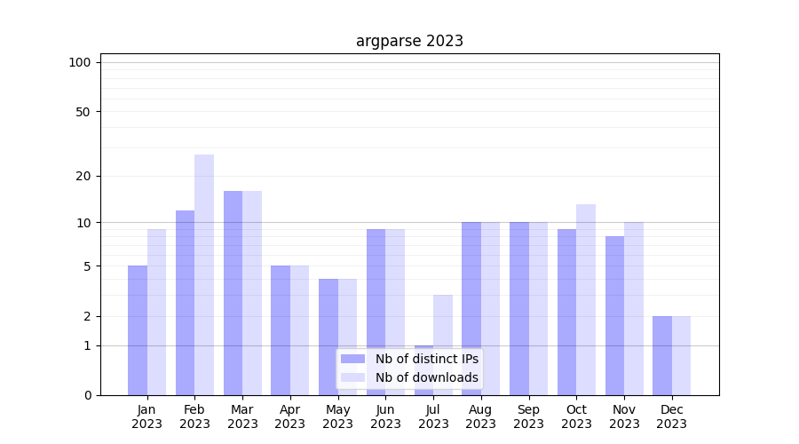 Number of downloads for annotation package argparse, year by year, from 2025 back to 2014 (years with no downloads are omitted):