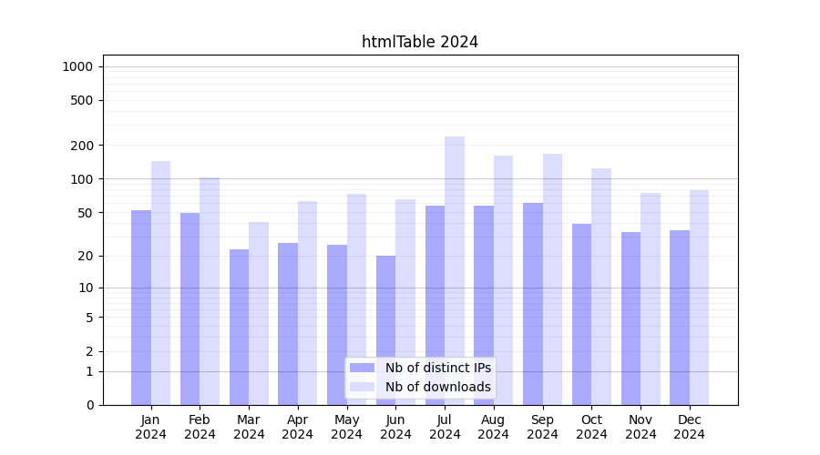 Number of downloads for annotation package htmlTable, year by year, from 2025 back to 2014 (years with no downloads are omitted):