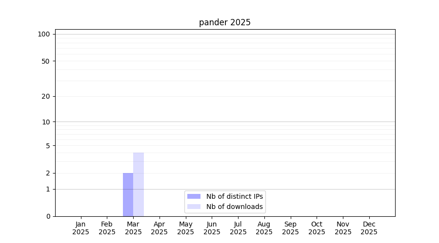 Number of downloads for annotation package pander, year by year, from 2025 back to 2014 (years with no downloads are omitted):