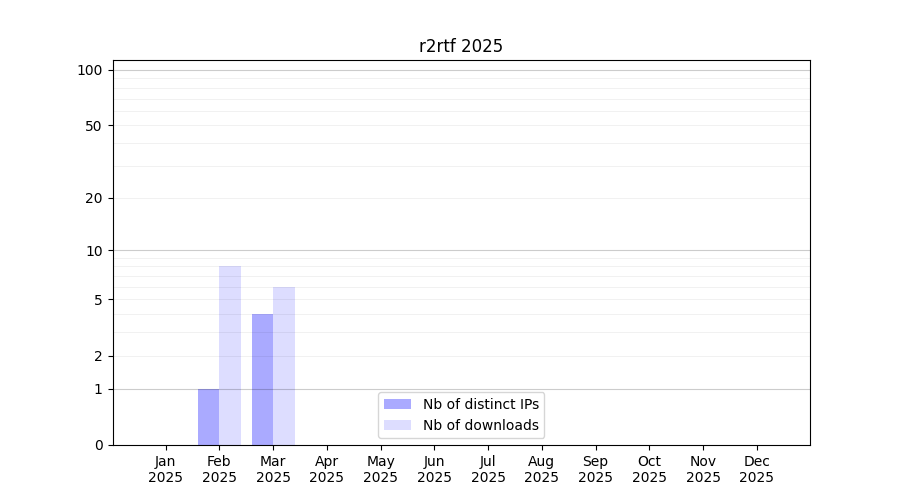 Number of downloads for annotation package r2rtf, year by year, from 2025 back to 2014 (years with no downloads are omitted):
