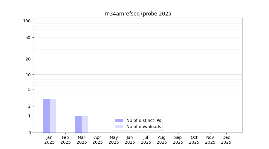 Number of downloads for annotation package rn34arnrefseq7probe, year by year, from 2025 back to 2014 (years with no downloads are omitted):