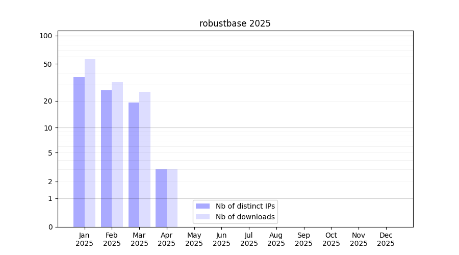 Number of downloads for annotation package robustbase, year by year, from 2025 back to 2014 (years with no downloads are omitted):