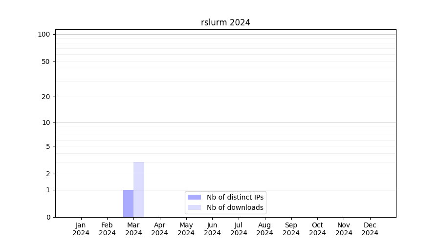 Number of downloads for annotation package rslurm, year by year, from 2025 back to 2014 (years with no downloads are omitted):