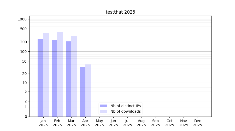Number of downloads for annotation package testthat, year by year, from 2025 back to 2014 (years with no downloads are omitted):