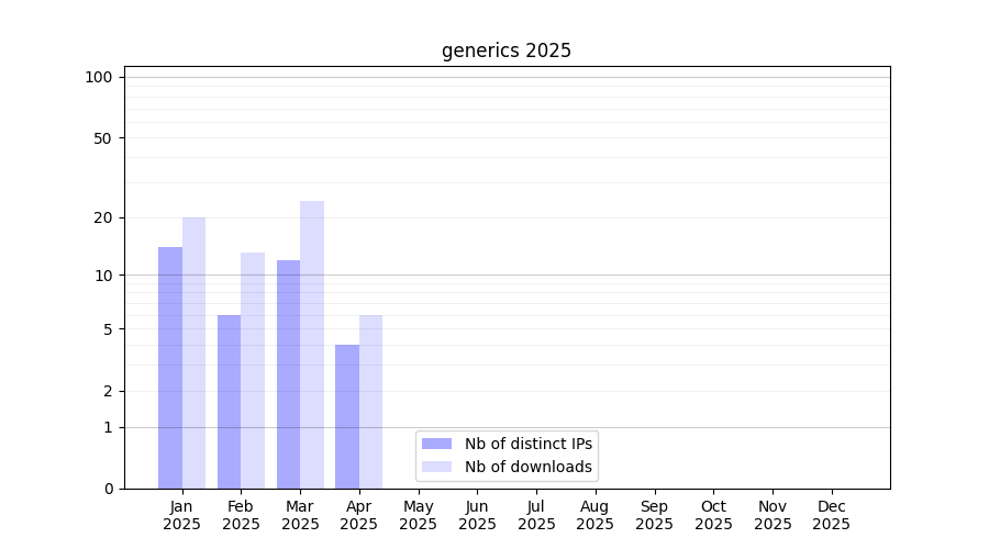 Number of downloads for experiment package generics, year by year, from 2025 back to 2014 (years with no downloads are omitted):