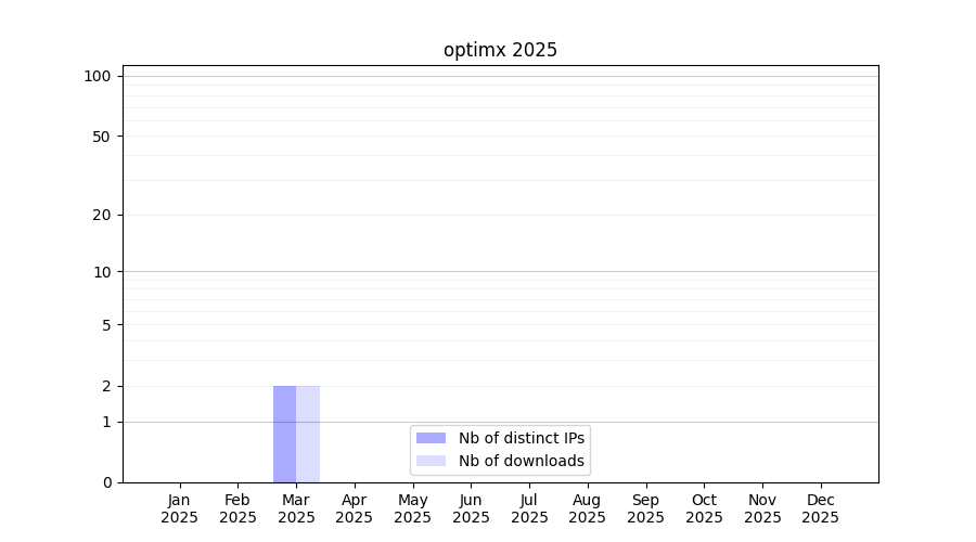 Number of downloads for experiment package optimx, year by year, from 2025 back to 2014 (years with no downloads are omitted):