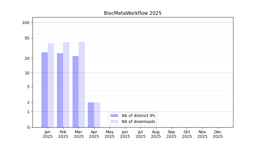 Number of downloads for workflow package BiocMetaWorkflow, year by year, from 2025 back to 2015 (years with no downloads are omitted):