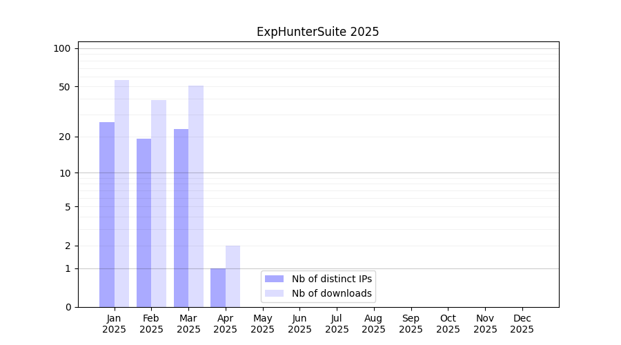 Number of downloads for workflow package ExpHunterSuite, year by year, from 2025 back to 2015 (years with no downloads are omitted):