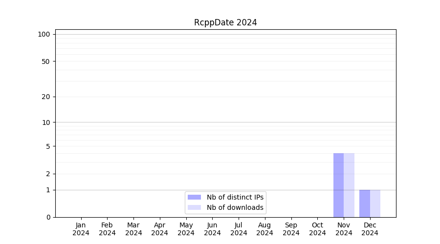 Number of downloads for workflow package RcppDate, year by year, from 2025 back to 2015 (years with no downloads are omitted):
