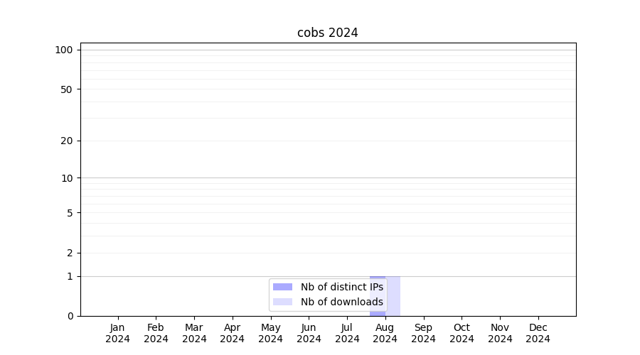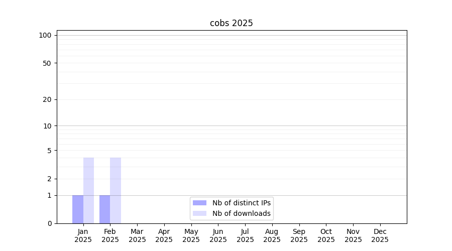 Number of downloads for workflow package cobs, year by year, from 2025 back to 2015 (years with no downloads are omitted):