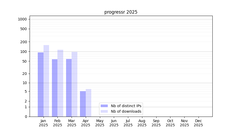 Number of downloads for workflow package progressr, year by year, from 2025 back to 2015 (years with no downloads are omitted):