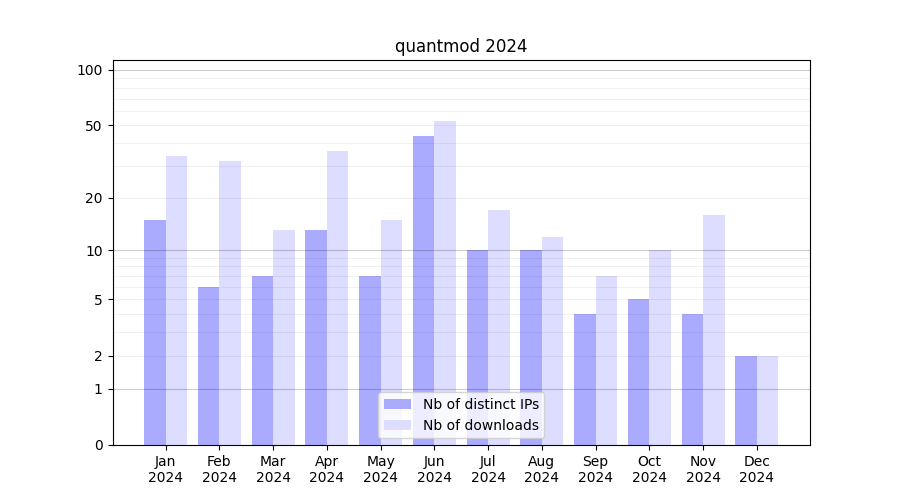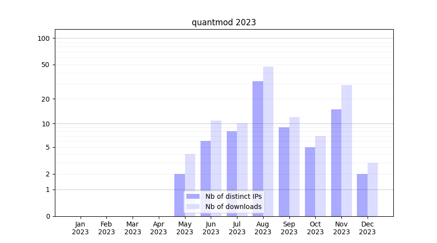 Number of downloads for workflow package quantmod, year by year, from 2025 back to 2015 (years with no downloads are omitted):