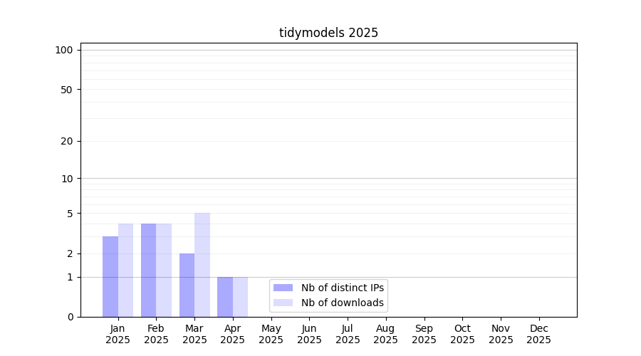 Number of downloads for workflow package tidymodels, year by year, from 2025 back to 2015 (years with no downloads are omitted):