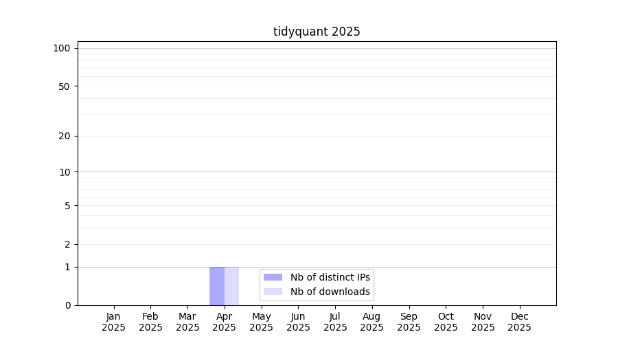 Number of downloads for workflow package tidyquant, year by year, from 2025 back to 2015 (years with no downloads are omitted):