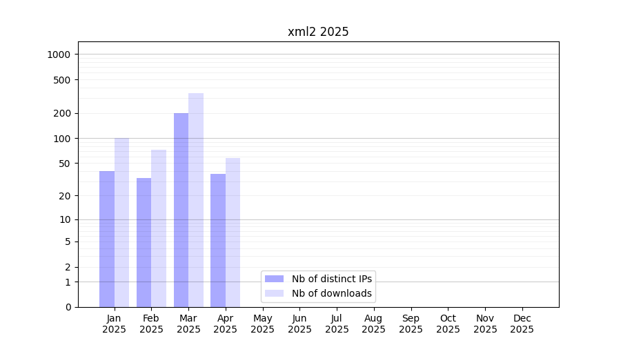 Number of downloads for workflow package xml2, year by year, from 2025 back to 2015 (years with no downloads are omitted):
