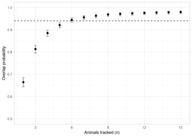 overlap <- boot_overlap(ud_matrix, R = 2000, method = "PHR")An asymptote could be considered once the mean overlap probability exceeded 95% of the estimated horizontal asymptote (Shimada et al 2021). The sample size linked to this value is deemed to be the minimum sample size required to represent the general distribution of the group.