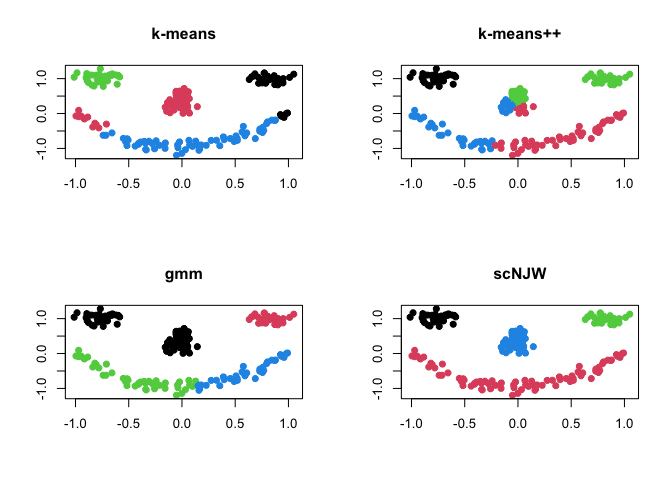 where each component of the face is considered as one cluster - the data has 4 clusters. Here, we compare 4 different methods; (1) k-means (kmeans), (2) k-means++ (kmeanspp), (3) gaussian mixture model (gmm), and (4) spectral clustering with normalized cuts (scNJW).