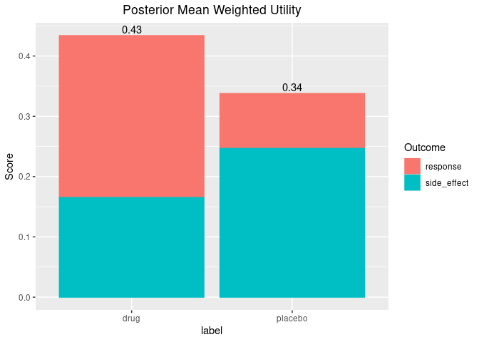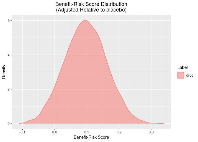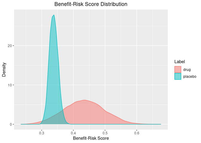 #> [1] 0.055In practice, we don’t actually know the “true” response rates or side effect rates, so including uncertainty in the estimate based on the data helps us to better quantify the amount of evidence for or against a new treatment. A natural way to do this is through a Bayesian analysis. Given samples from the Bayesian posterior (based on data), we can estimate the uncertainty in the benefit-risk score of each treatment arm.
