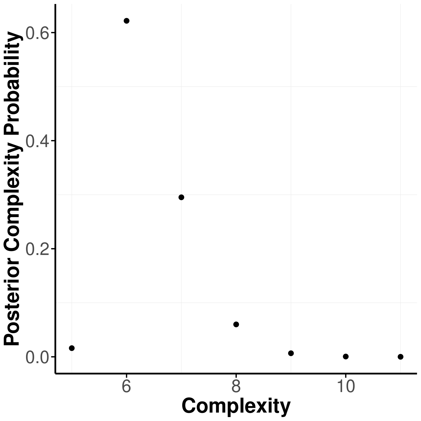 The structure uncertainty can be assessed with the posterior structure probability plot and the posterior complexity plot. The posterior structure probability plot shows the posterior probabilities of the visited structures, sorted from the most to the least probable. Each dot represents one structure. The more structures with similar posterior probability, the more uncertain the true structure. If one structure dominates the posterior structure probability, we can be relatively certain about the true structure.