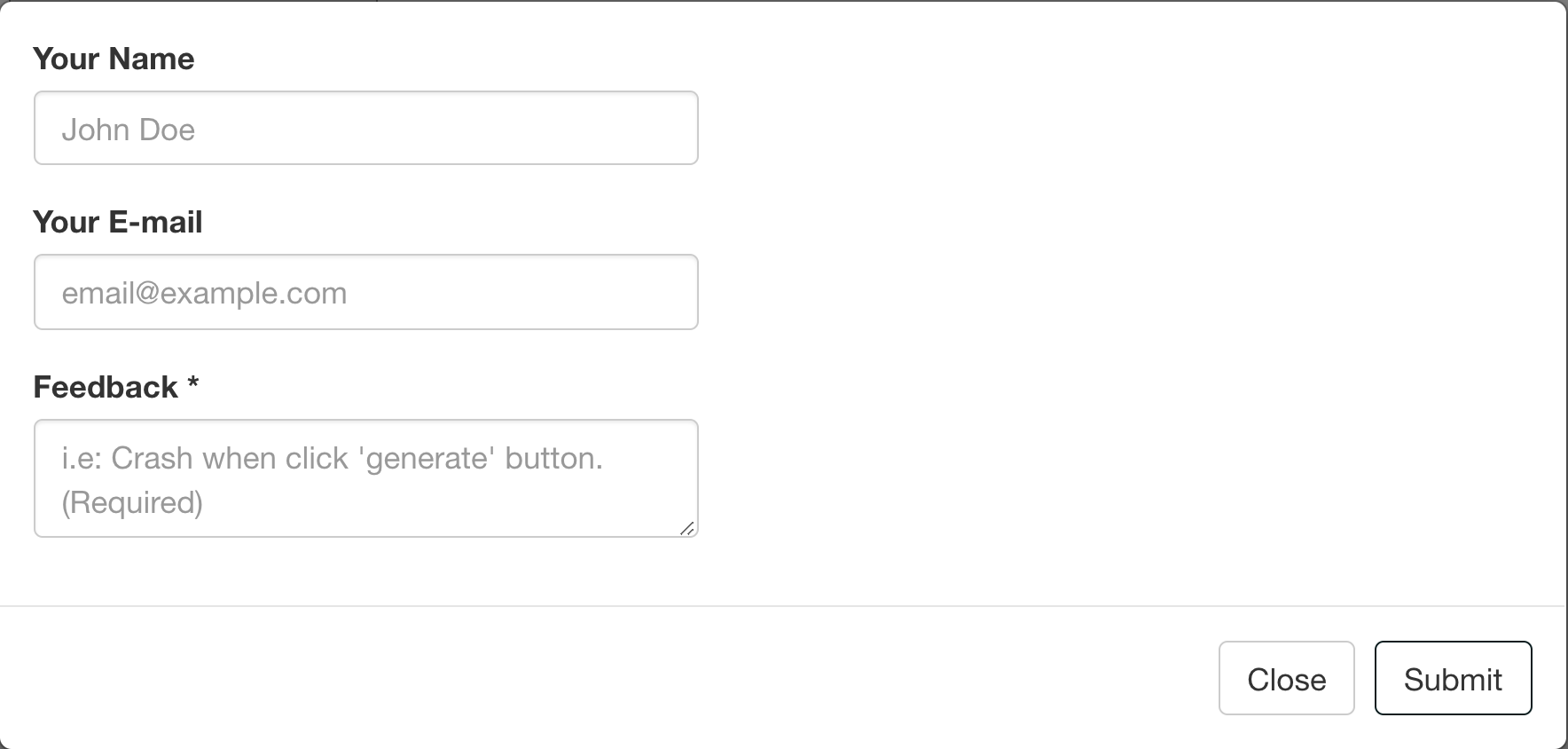 You can see button named “Show feedback modal”. This message is default, and you can change it. When you click, you will see modal below.