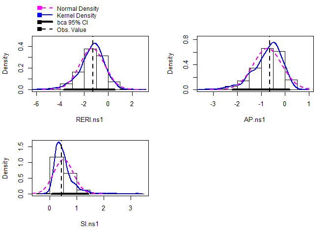 This produce histograms of the distribution of each of the three bootstrapped parameters (RERI, AP and SI), allowing the user to inspect the overall performance and accuracy of the returned estimates.