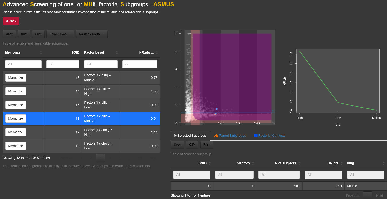 The challenge to the user has been to find subgroups which are worth pursuing. There was no feature, which guided the user through the process of finding worth pursuing subgroups. The newly implemented feature ASMUS helps to find all worth pursuing subgroups semi-automatically. Subgroup analyses are performed to assess the heterogeneity of treatment effects across different groups of patients. There are always subgroups with a treatment effect which differs from the study treatment effect. The fundamental question is whether this observed treatment effect is reproducible or an incidental finding. This is a matter of the causal influence of the subgroup-defining factors. Theoretical knowledge or experience can provide evidence. Ultimately, only another clinical trial can answer the question. This is neither a matter of the size of the treatment effect nor the number of patients in the subgroup. Consequently, statistical tests cannot answer the question. Screening a data set from a clinical trial can only mean to identify subgroups that are worth pursuing in terms of reproducibility. A subgroup is worth pursuing if and only ifThe assessability of a subgroup is indispensable in a subgroup